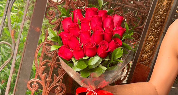 Flores frescas, arranjadas com delicadeza e amor. Um buquê de rosas transmite sentimento sem precisar de palavras.