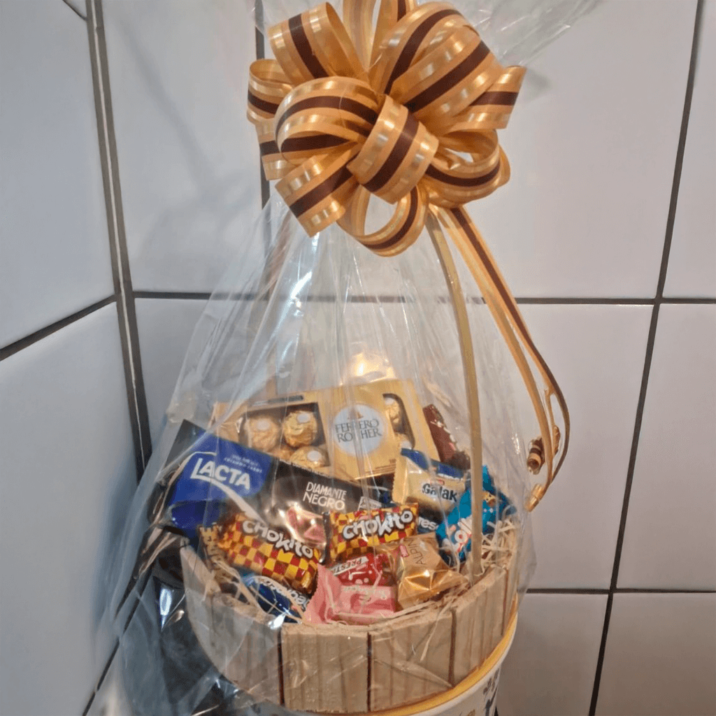Uma cesta repleta de chocolates e doces que encantam.